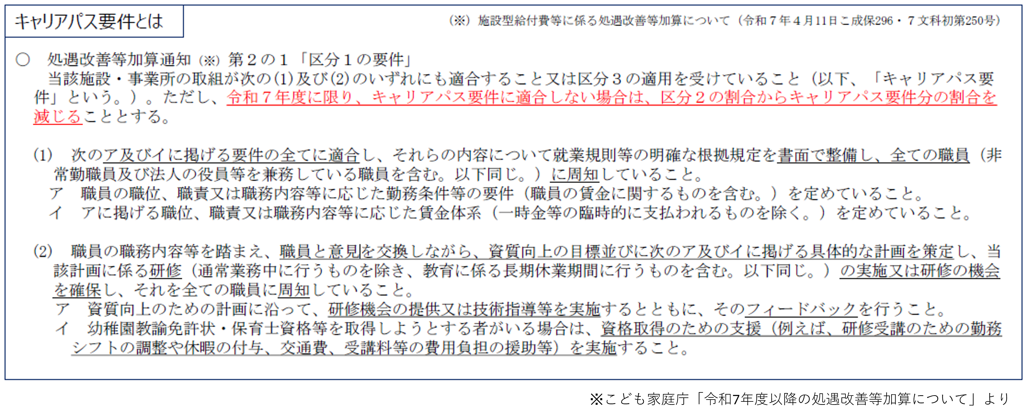 経験に応じた昇給制度の整備、職場環境の改善。 ★キャリアパス要件が必須に ※経過措置として、R7年度に限りキャリアパス要件を満たさない場合は区分2からキャリアパス要件分の割合を引くことで申請は可能。 |